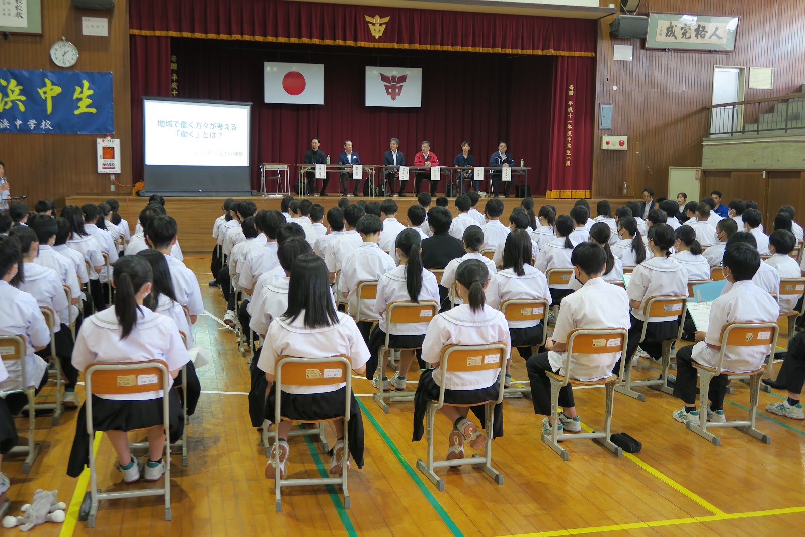 2年生では「総合的な学習」の授業として「ふるさと仕事塾」を行いました。商工会議所にお世話になり、地元で働く6名の方に来校していただき、「地域で働く方々が考える『働く』とは?」をテーマにパネルディスカッションを行いました。それぞれの方の仕事への想い、そして地元で仕事をすることへの想いなどを聞かせていただきました。いろいろな立場からの話は非常に生徒たちにも参考になったと思います。